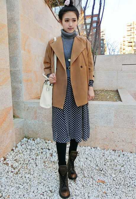 时尚翻领BF风的宽松冬季毛呢外套,搭配高领毛衣,是成熟的上班一族最佳的搭配,达人的铆钉军靴搭配,轻松美翻整个冬季。