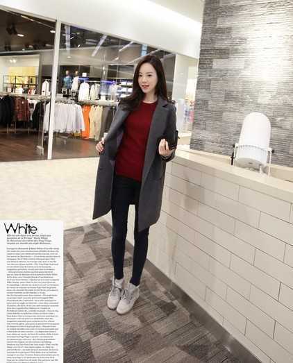 中长款修身版型的冬季呢子外套,内穿搭打底毛衣和紧身牛仔裤,显得既时髦,同时具有非常好的保暖效果。