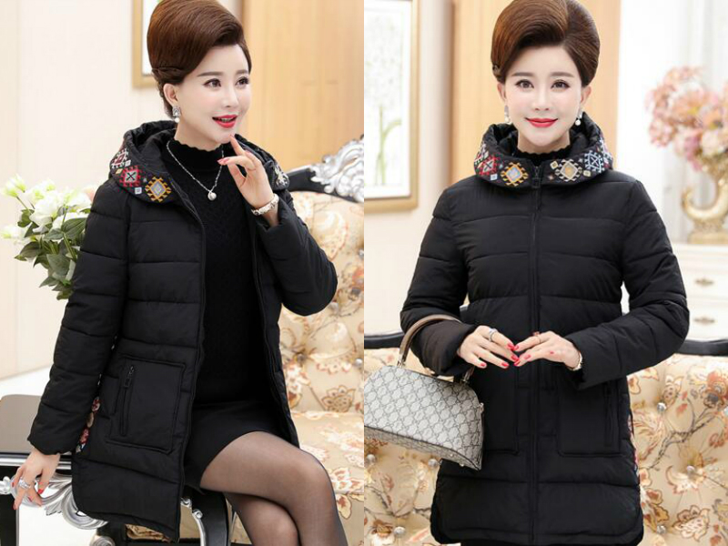 此款冬装棉服裁剪得体,适合中年女士既追求时髦又要端庄的着装特点,大方的衣领围绕脖子温暖防寒,合理的腰身设计修饰腰间赘肉,简易的下摆在视觉上起到瘦身效果,加上经典的黑色,更是显瘦又百搭。