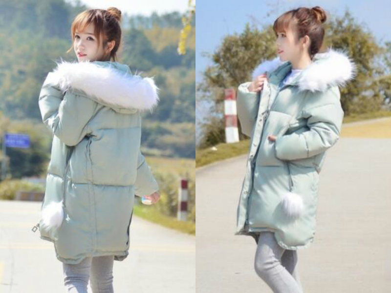 不同长短的下摆显得很独特,简约立体的版型搭配着一些可爱的小心思,白色毛绒绒的毛领,口袋挂着白色的小毛球,马卡龙浅色系,整体让人觉得既柔软温暖又可爱甜美。