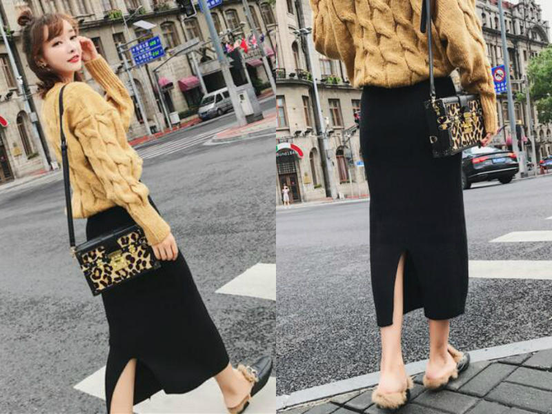 这款包臀A字型的羊毛半身长裙,紧身包臀的设计很好地显示出身材的完美曲线,裙摆后面的性感小开叉让身材变得更加迷人,随意搭配一个金色的小包包,给人眼前一亮的感觉。