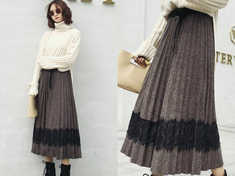 这款百褶羊毛半身长裙,风琴褶般的褶皱,增加了立体感和层次感,给人蓬松的感觉,裙摆缝上黑色花纹的装饰,走动时裙子一摇一摆间散发着大气迷人的气质。