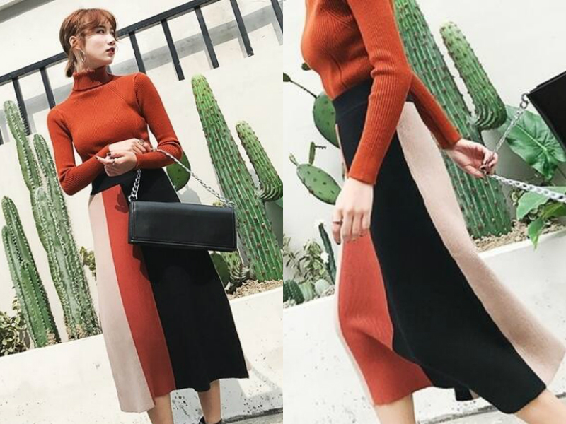 这款铅笔型的羊毛半身长裙,简洁修身的剪裁,不同颜色的搭配拼接,极显高挑的身材,同时也很有英伦风的感觉,自然而优雅,让你轻松舒适地走在街上。