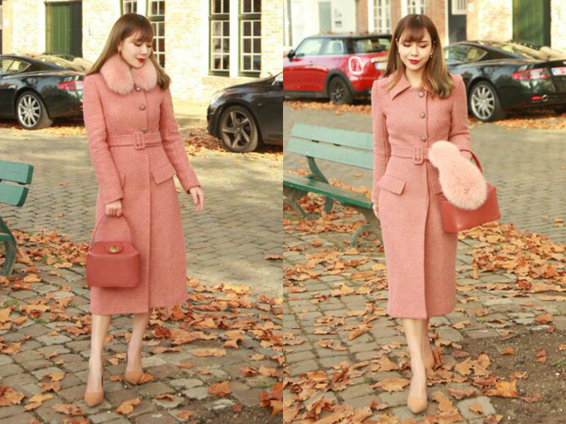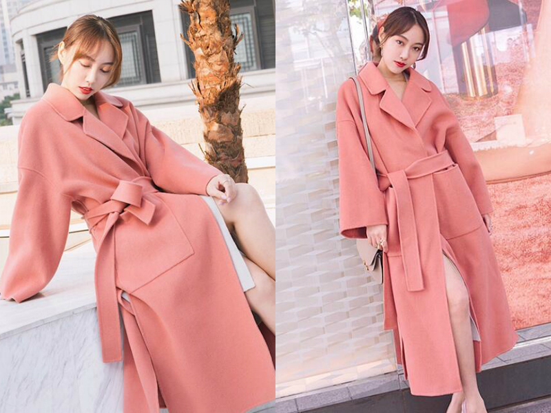 经典的浴袍长款大衣,宽松的版型,腰间侧边绑上绑带,穿起来很有慵懒范,流行的珊瑚粉颜色显得温润优雅又有仙气,高级别的羊绒很轻盈柔软又非常保暖,冬天里面穿一件羊绒毛衣,外面套上这么一件大衣就可以轻轻松松凹造型,告别臃肿身材。