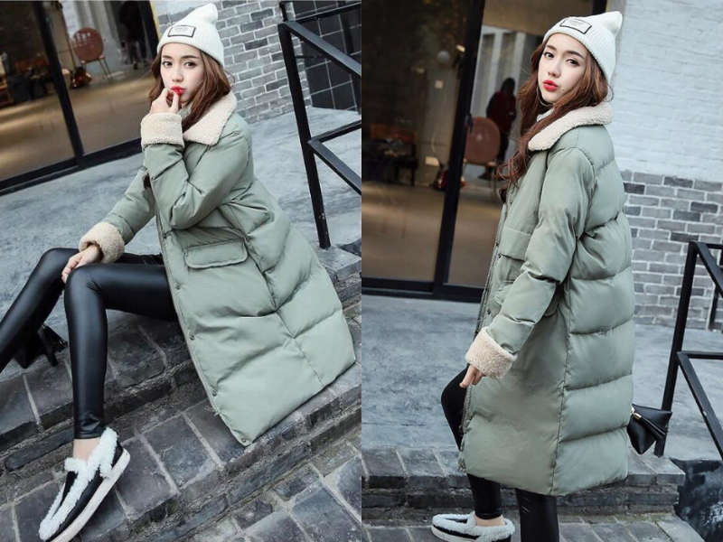 这款豆绿色的棉衣在冬季穿好看又保暖,长款修身宽松的版型很好地遮住肉肉,有显高显瘦的效果,腰间的拼接更是拉高了腰线,打造高挑的身材比例,羊羔毛的小翻领和袖口,隐藏式的口袋,彰显时尚,加上小清新的豆绿色,让女生穿着起来特别有气质。