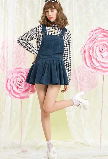 甜美百褶裙摆,日系的牛仔风背带短裙,洋溢出甜美可爱感,穿出青春甜美造型,内搭永不过时的千鸟格上衣,彰显时尚百变女王范儿。