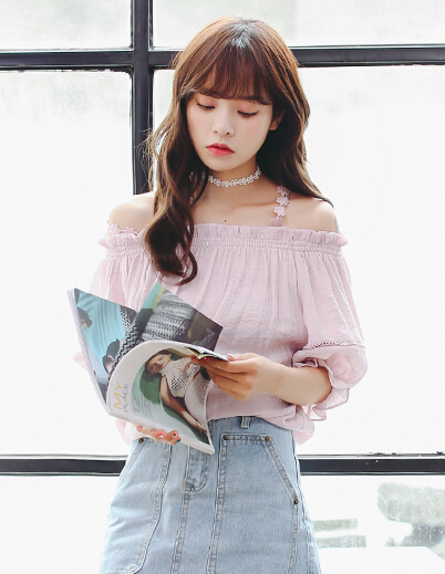 【日系女装上衣款02】日系甜美一字领女装上衣文艺感十足,衣服的手十分地柔软舒适,而最为特别的是花朵吊带的设计展现出清新俏皮的感觉,整体看上去非常的简洁大方,而粉色的上衣更是充满了淑女般的温柔感。