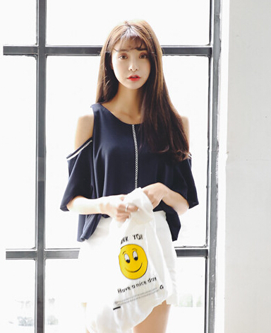 【日系女装上衣款05】同样是露肩的日系女装,这款则给人一种大气斯文的感觉。深蓝的上衣颜色能立显女生白皙的好肤色,荷花袖的设计飘逸自然,雪纺麻混纺的衣服材质更是令人爱不释手!