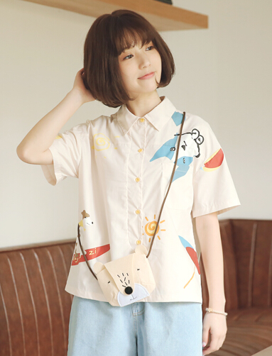 【日系女装上衣款04】洁白的衬衣款式搭配着充满童趣的卡通图案,中袖的袖口设计让女生可以轻易就藏住拜拜肉,直筒的款式版型还能修饰出好身材,单排多扣的上衣款式非常地有青春气息,活力朝气并存!
