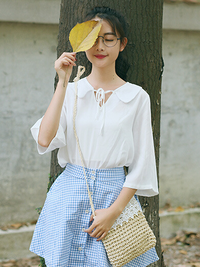 【日系女装上衣款03】白色的雪纺衫集可爱与优雅于一身,娃娃领的设计减龄可爱,清爽可爱的感觉非常适合炎热的夏季,无论是搭配怎样的下装都能轻松搭出自己的味道,非常纯洁清新。