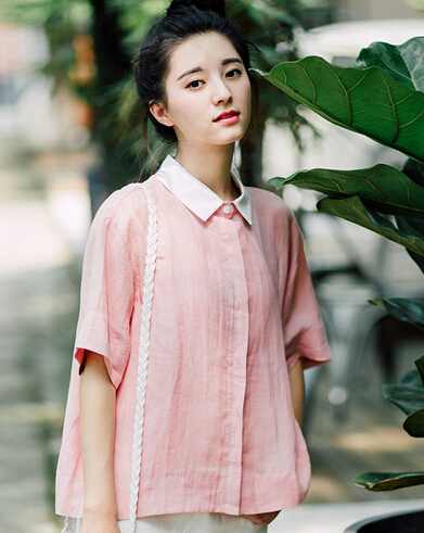 日系T桖款02》》》》》粉嫩的上衣十分地柔情好看,如此娇嫩的衣服颜色搭配着白色翻领设计凸显出干净休闲的气质,而宽松的款式能让在炎热的夏天拥有透气凉爽的穿着享受,不管是搭配裙子还是裤子都是非常好看唷!