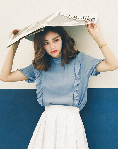 日系T桖款01》》》》》立领的荷叶袖上衣款十分地精致好看,浅蓝的衬衫颜色清新脱俗,荷叶袖的设计甜美可人。单排多扣的设计更为整件款式添加了新意,尽显斯文大气的女生感觉。