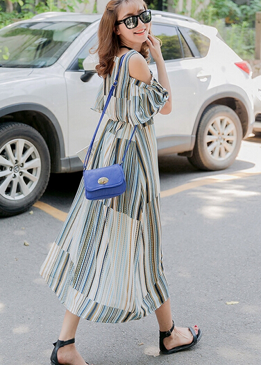 【韩版长裙款01】镂空的背部设计彰显着女人的性感魅力,露肩的款式清凉舒适,而竖条的长裙款式更是能展现出清新自在的韩系风格,收腰的部分还能立显好身材,在行走间都能飘逸甜美,非常好看。