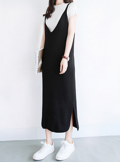 【韩版长裙款05】大V领的黑色开叉长裙优雅大气,吊带的款式反而不会令人觉得性感妩媚,给人的却是小清新的时尚感,以背带裙的方式设计完全符合了韩式风格中的自然魅力,简单的上衣内衬都能令人好感大增喔!