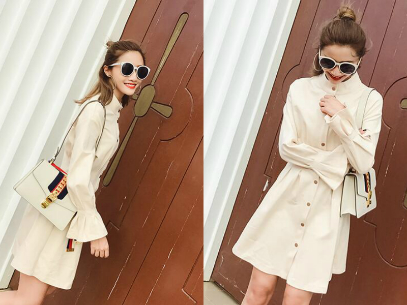 这一收腰衬衫裙袖子是花瓣型的设计,在腰线和袖口有一些褶皱,显得有公主风范,衣门襟采用了简约一排扣设计,穿上去也是不缺乏大气淑女气息,连衣裙简单,不用为搭配烦恼。