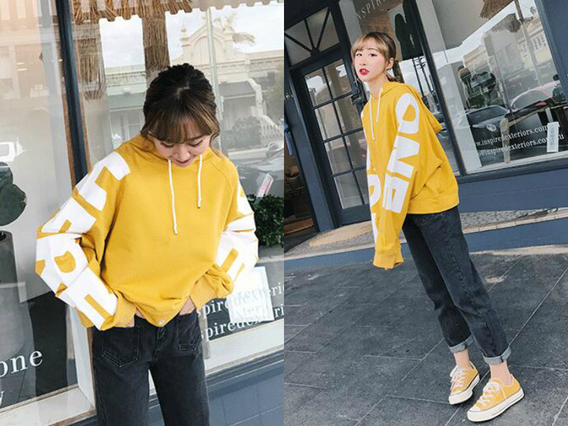 亮眼的黄色让人一眼就能看见,这件柠檬黄色的韩版ulzzang卫衣设计很大胆,只有袖子上有两个大大的白色字母印花,看起来非常新潮,搭配黑色车牛仔长裤清爽大方,而且脚上穿的也是柠檬黄色的帆布鞋,整体造型不管颜色还是衣服的搭配都很有潮流感。