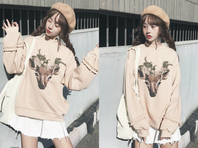 似乎没有哪个女生会不喜欢可爱的东西,把一个可爱的小麋鹿头印在卫衣上,使原本普通的卫衣立刻变得潮气十足,裸色的颜色让人感觉干净舒服,袖子上独特的花边设计更使这款ulzzang卫衣增添甜美感,选择一条白色短裤搭配清纯之余又满是潮流气息。