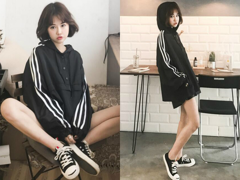 妹子一身的黑色装扮看起来很酷,带有条纹边的袖子使这款韩版ulzzang卫衣充满运动feel,连帽的设计更是增添时尚活力感,与下身同是黑色的裤子和鞋子完美衔接,再剪一个活泼的荷叶头发型,满是小女生的俏皮感,简直不要太吸引人!