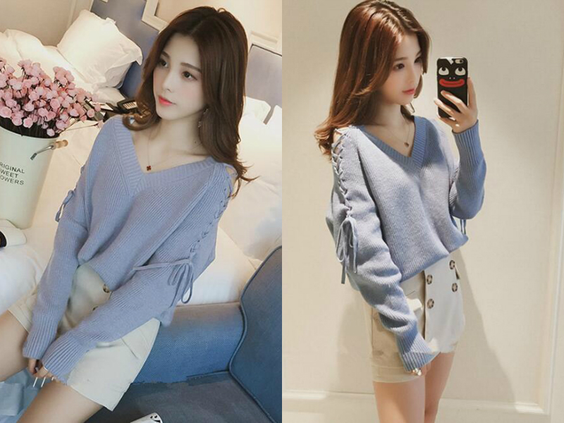 也是比较有特色的一款针织衫,V领的设计显瘦又带着点小性感,袖子上编织的蝴蝶结设计增添甜美感,浅紫的颜色清新而自然,穿在妹子身上油然而生出一种淡雅的气质。