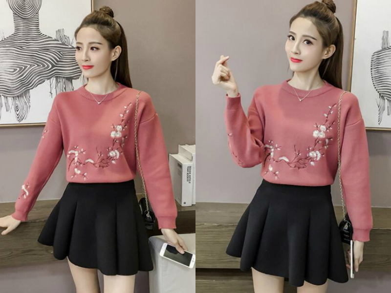 这样的针织衫与半身短裙的搭配漂亮又耐看,皮粉色的针织衫外形有点像卫衣,款式简约大方,在上面绣上梅花图案立刻变得很有辨识度,搭配一条黑色百褶裙,风格甜美又文静。