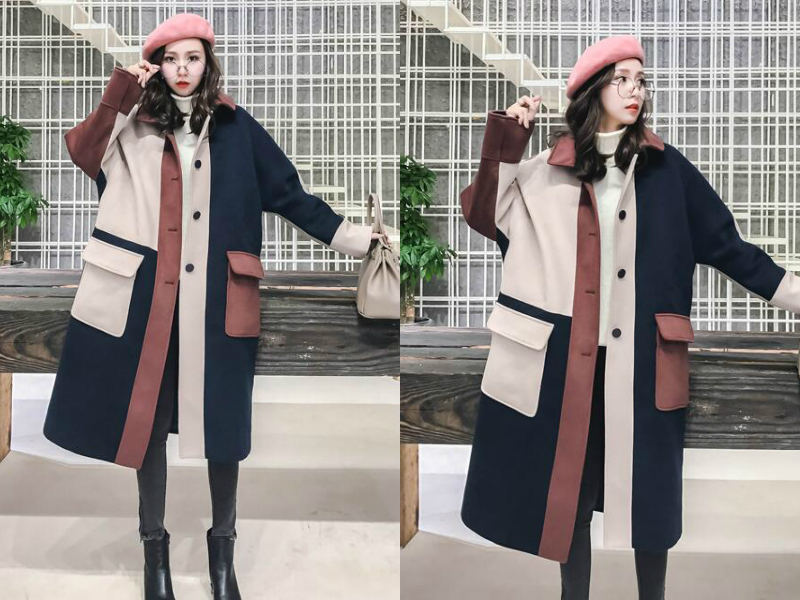 非常独特的一款韩版长款呢子大衣,长至小腿的茧型设计宽松而不挑身材,连肩袖的设计使大衣显得更加挺括有型,新颖的拼接色给人眼前一亮的感觉,三个颜色搭配得恰到好处,美好之余更显个性时尚女神气质。