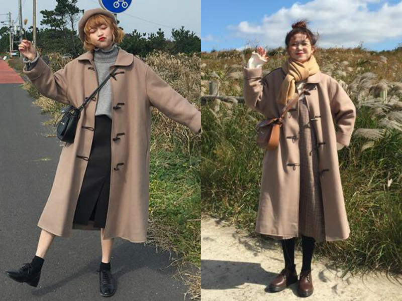 喜欢韩剧的妹子都知道,里面的男女主角经常穿着大衣,那你们有没有发现牛角扣大衣的出镜率很高呢?一件又长又大的外套穿在身上瞬间把妹子包裹住,显得娇小可爱,常规的polo领简单不失时尚感,袖口的翻边裁剪设计为外套增添别致特色,一排整齐的牛角扣装饰也给整件衣服添加了一些学院feel。