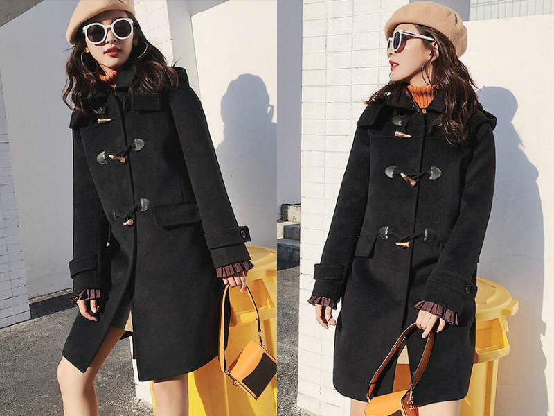 黑色深沉经典,使这款牛角扣外套更百搭耐看。H版型修身显瘦,内里内衬增添夹棉,防风更保暖,帽子的设计可拆卸,佩戴时显得休闲可爱,拆下又显得简单利落,翻盖的大口袋设计实用大方,让你的双手收插更自如,加上门襟上复古做旧的牛角扣,更给人一股浓浓的学院风,时尚又减龄。