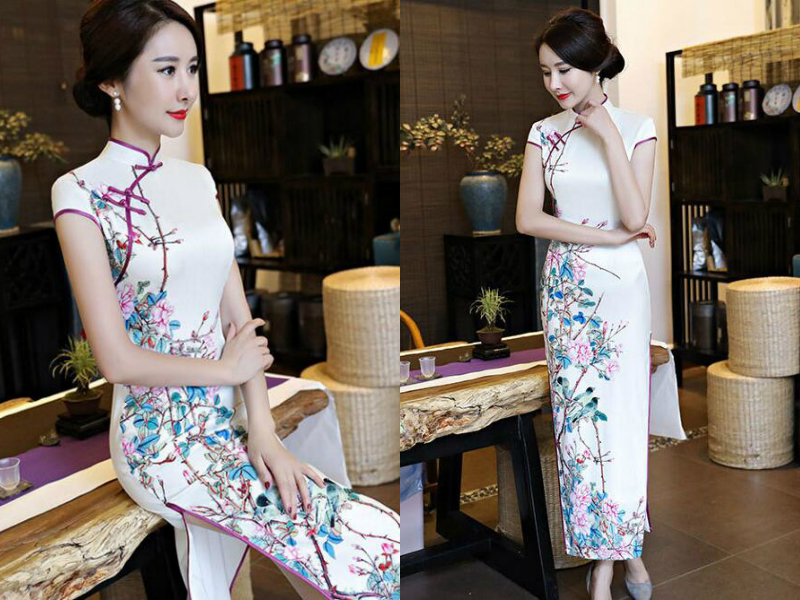 这款旗袍立体剪裁修身版型,凸显女性婀娜多姿的身材,典雅的传统立领勾勒出纤细修长的颈部线条,性感复古的开叉设计,展现女性腿部的优美线条,洁白的纯色,中国风花鸟图点缀衣身,衬托出女性的东方韵味。