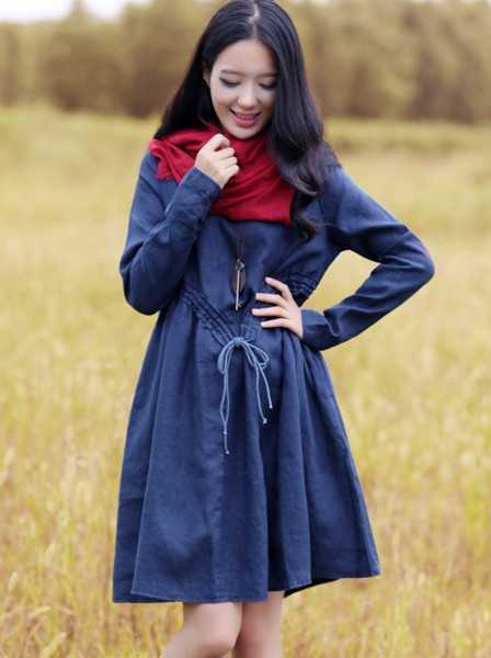 沉稳的深蓝色棉麻连衣长裙,在腰间V字收腰设计,凸显出纤细腰身曲线,蓬松的下摆,增添了几分甜美感,让沉稳成熟女性不乏几分亲切感。