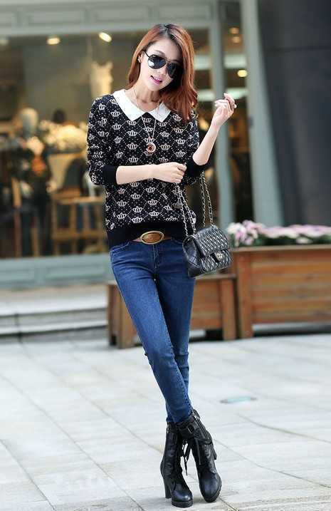 可爱卡通图案,气质的翻领,上身效果非常时尚的一件春季毛衣,搭配紧身牛仔裤和靴子,非常时髦哦!