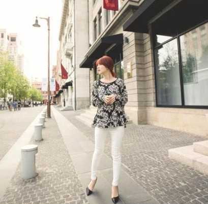 在流行印花时尚上衣里,不管是T恤还是打底衫,抑或是雪纺衫,都穿出了清新别致的格局来。