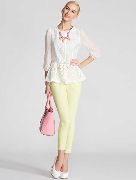 春季镂空白色衬衫,独特雪纺与棉质结合,给人一种扑鼻清香的感觉,随意搭配亮眼嫩黄色裤子,轻松让你时尚百倍,完美展现出女性柔美的一面。