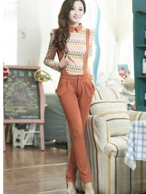 运用时下活泼减龄的背带款式的春装套装,内可穿搭一件娃娃领上衣,整体呈现甜美、可人感。