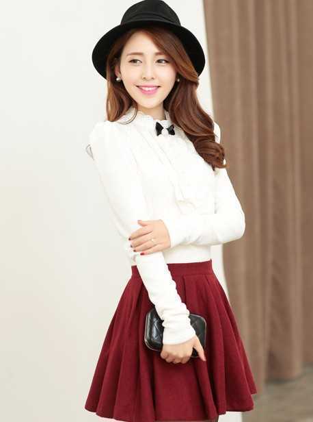 春季韩版高领雪纺衫,小可爱的蝴蝶结点缀着,增添甜美气息,搭配复古短裙,穿出甜美又显时尚装扮。