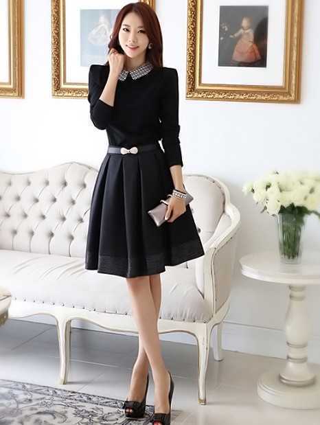 百搭时尚感的春季黑色高腰连衣裙,精心的黑色珍珠细腰带搭配,凸显出完美纤细腰身曲线,让你完美展现出窈窕好身材。