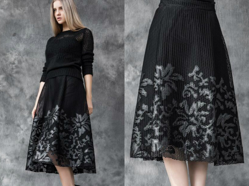 充满现代科技感的一条网格贴片半身裙,乍看上去就觉得非常独特。后现代感的网格面料中和了黑色调带来的沉重感,不规则的镂空印花的纹饰展现了酷帅与柔美的结合,弧形的腰部设计穿着更舒适,隐形的高腰更有助于拉长身材比例。