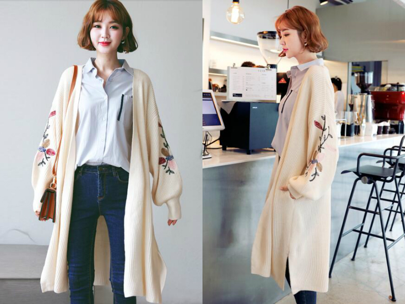 带有刺绣图案的一款中长开衫,灯笼袖的设计潮流独特,并轻松修饰手臂线条,袖子上的刺绣图案为整件开衫增添文艺feel,也为以米色为主调的开衫增加了丰富的色彩,下摆长至膝盖并侧边开裂,拉长身形又显得人很温婉。