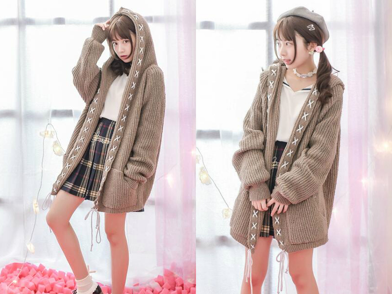 同是一款卡其色的中长款开衫,却是不同的风格。连帽设计休闲简约,中长的款式保暖的同时又修身显瘦,穿插的系带设计是一大亮点,使整件开衫变得新颖有格调,垂在下摆的系带更显得个性满满,两侧对称的口袋实用美观,整件开衫的森女气息也很浓郁!