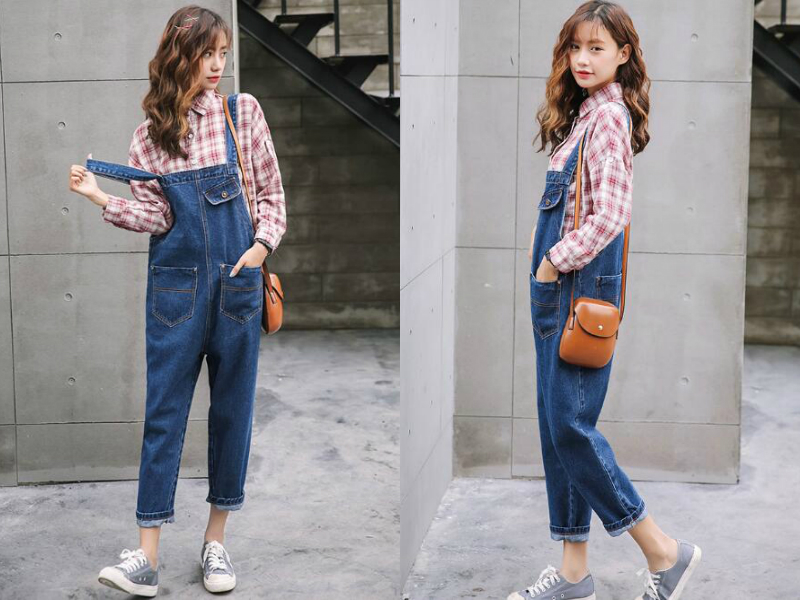 背带九分牛仔裤个性又帅气,很显青春活力,宽松的版型不挑身材,干净利落流畅的线条很好的重塑身材,拉长身体线条显高显瘦,裤脚可以翻起来穿,露出脚踝,让你轻松穿出大长腿的既视感。