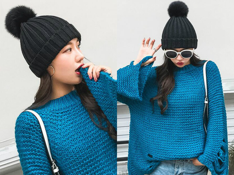 大家可能会觉得黑色的毛线帽有点单调了,但看妹子这样搭配起来不是很好看吗?简约的黑色毛线帽稳稳的戴在头上,感觉整个脑袋瞬间被温暖填满,黑丝的小毛球竖立在头顶,不经意又增高了妹子的身高,搭配一件深蓝色的宽松针织衫,看起来大方时尚,很有日韩feel。