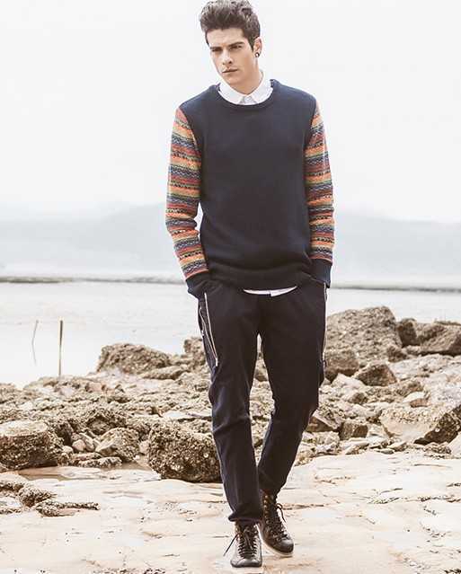 袖口与衣衫主体拼接的男士圆领套头毛衣,具有良好的保暖性,时尚大气,质感柔软舒适,穿着大方有型。