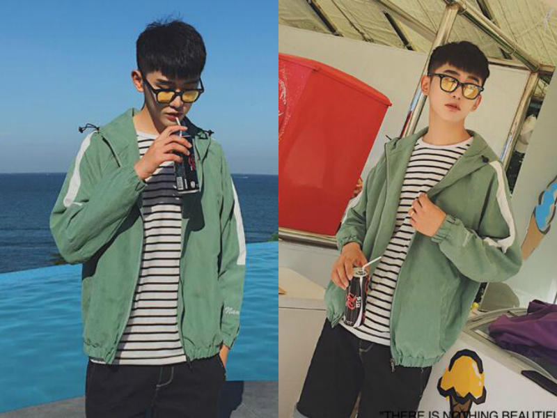 比较简约型的一款港风bf外套,清新的青草色让人看了觉得很舒服,袖子两边多一条白色边,使整件外套没那么单调,里面搭配一件黑白条纹T恤,下面穿一条黑色牛仔裤,整体颜色看上去更加和谐养眼,帅帅的。