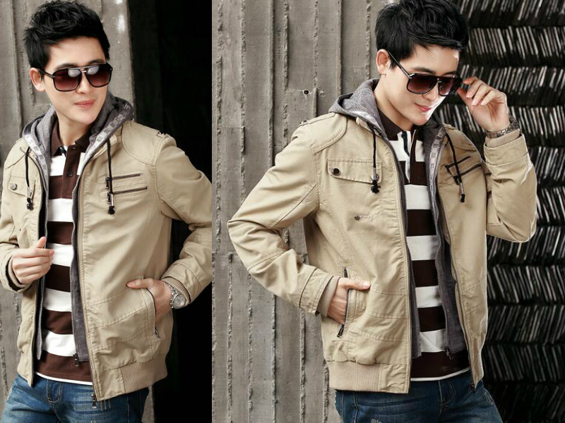 这是一款卡其色的假两件纯棉夹克外套,纯棉面料舒适性和透气性很好,毛绒内衬加厚设计厚实又保暖,帽子部位可以拆卸,一衣两穿so easy。肩部按扣的装饰大方时尚,衣服内侧有一字内口袋,简单却实用,胸前双拉链设计潮流酷炫,袖口采用双层设计,舒服无束缚更防风。