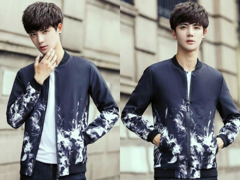 这款夹克外套硬朗利落的版型,立领的设计,低调内敛的藏青色非常易搭,衣服上的白色火焰渲染时尚感,高档大气的面料,穿上它男友力max。