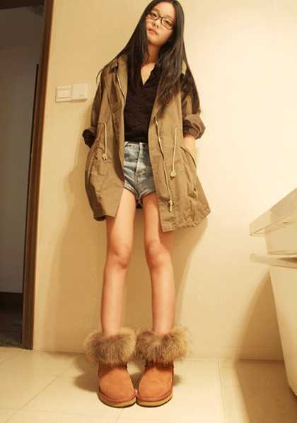 很经典的一款狐狸毛雪地靴,复古的颜色,圆头和厚底的设计,有增高的效果,属于超百搭的,一件大衣外套,V领打底衫,磨边牛仔小短裤,如果觉得冷的还可以搭配一条米色打底裤,非常好看。