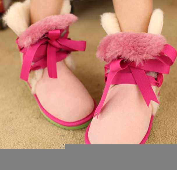 卡哇伊的玫红色雪地靴,丝绸般的鞋带装饰着,玫红色与白色羊绒拼接,如此独特个性的撞色设计,很时尚卡哇伊呢!