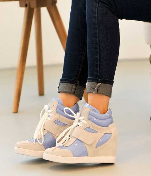 时尚的淡蓝色色彩,让人有一种清纯舒适的感觉,白蓝相间的冬季高帮内增高运动鞋,轻松穿出小清新时尚感。