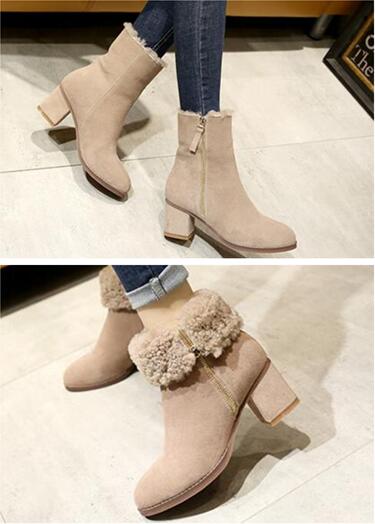 简单大方的粗跟短靴,磨砂的牛皮细腻有质感,流行的驼色更显高档时尚,金属的拉链,圆头的设计,融入的这些流行元素为鞋子增添优雅的气质,鞋子内里一层柔软的羊羔毛,跟雪地靴一样给你温暖,无论折起来还是竖起来穿都能让你穿出时髦感。
