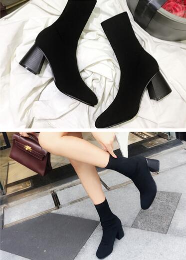 这款松紧袜筒粗跟短靴今年很是火爆,亮点就是高密度松紧袜筒的设计,针织弹力的面料弹性柔软,不紧绷不变形,上脚很是好看特别显腿长,圆头的鞋头显得小巧,粗跟穿着舒服不会累,黑色更是有显瘦的视觉效果,时尚百搭。