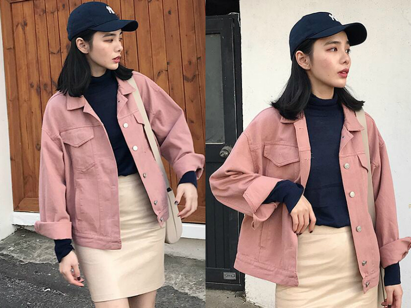 穿粉色通常会给人甜美乖巧的感觉,可妹子身穿这件皮粉色外套给人的感觉并不是如此。虽然这件夹克外套穿着女生身上稍微有点宽,却并不会觉得臃肿,深色的上衣本就显瘦,而裸色包臀半身裙则是突出下半身的纤细,因此整个搭配显得休闲又自然。